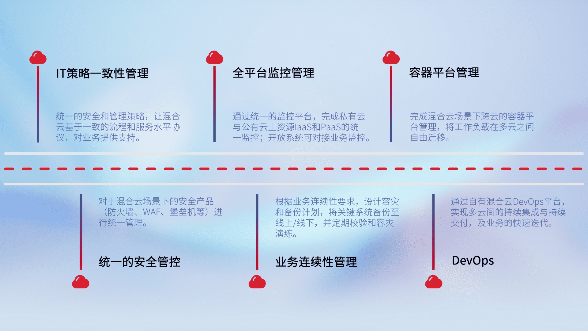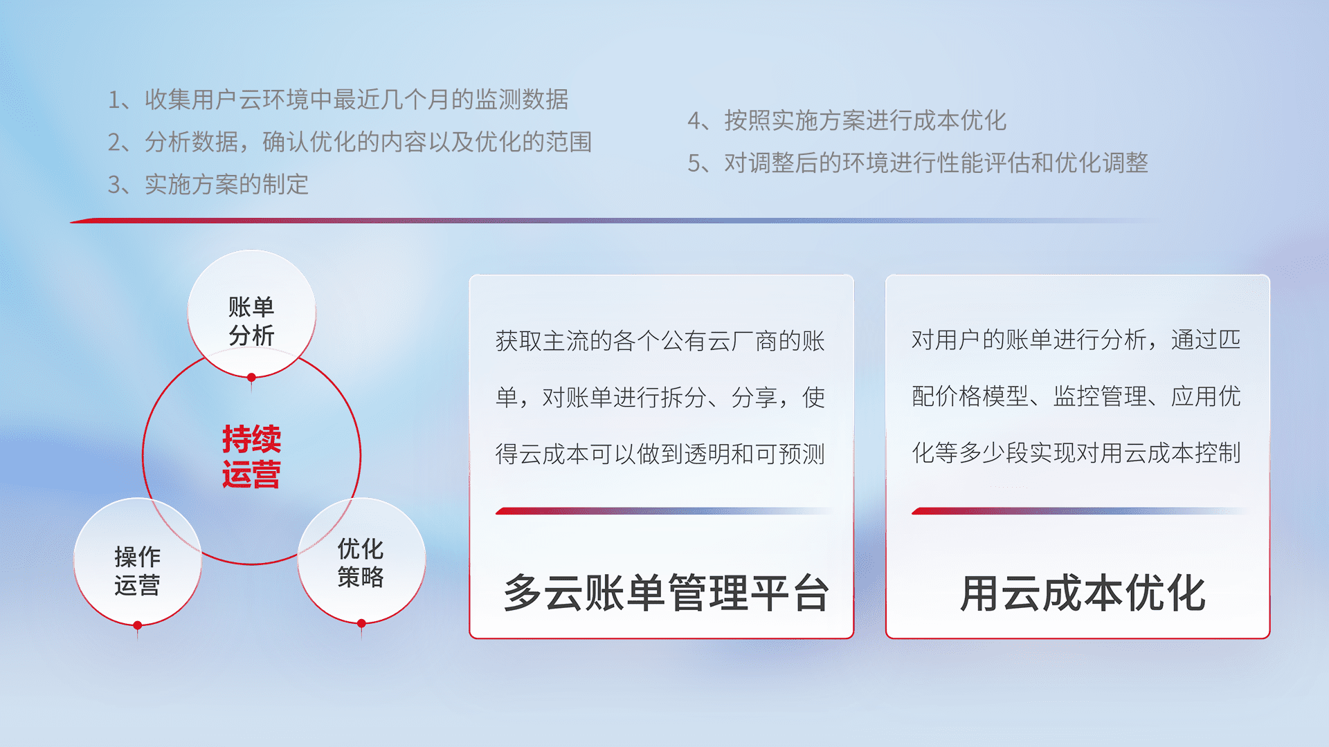 通过多云纳管,,,,以统一的资源数据模型把客户的云资源进行抽象和封装,,,进而实现对多云资源的统一操作,,,,保障云资源管理的可靠性、、、稳定性与可用性。。量身定制化运维内容,,配置、、开发运维、、、补丁管理、、备份、、、监控、、、、认证和访问管理、、、审计和日常巡检等,,保障在用云过程中的可靠度,,,,稳定度以及高可用率。。