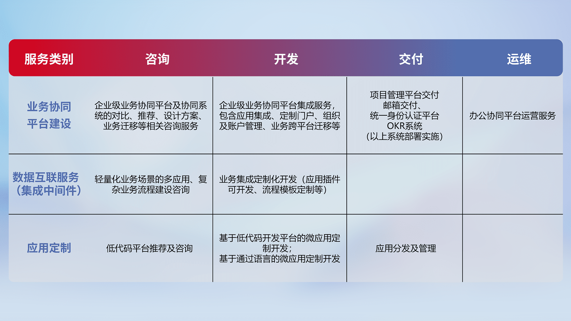 针对钉钉、、企微、、IDaas等平台级产品提供产品的规划、、方案、、、交付、、、、定制化开发等服务,,,,实现如统一协同办公、、、智能客户服务、、混合会议管理、、、智能数据查询、、、等业务场景,,实现数字化转型。。。。